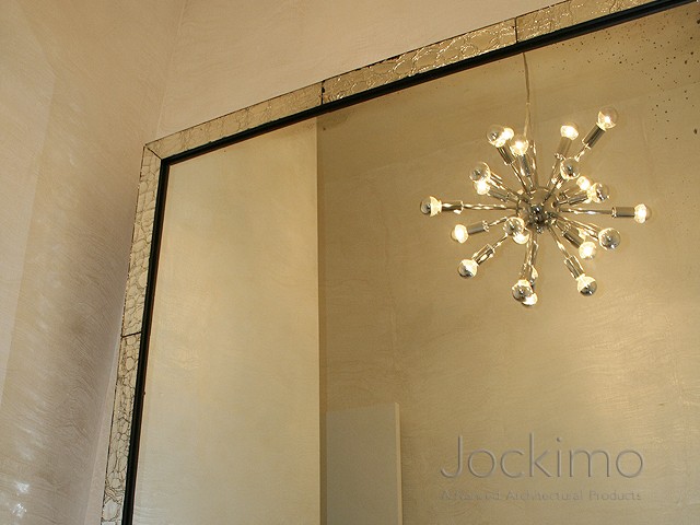 This mirror features “floating” mouth blown crackle glass frame @ 3” wide by 1” deep with mitered corners. Tarnished distressed and silver finishes available. Available in most MirrorUnique™ antique mirror finishes on mirror field. (This photo shows an Antique Pinhole mirror as the main body.)