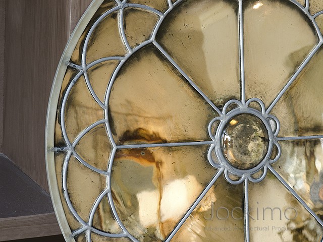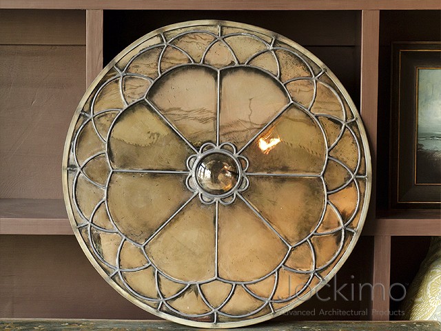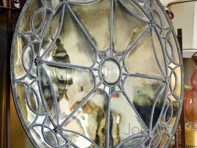 This leaded mouth blown restoration glass art mirror includes a 4” convex cast glass lens in the center. The lead is ¼” wide. The piece is 1” floating from the wall and is finished with a ½” zinc outer frame. Available in most MirrorUnique™ antique mirror finishes. Custom sizes are available.