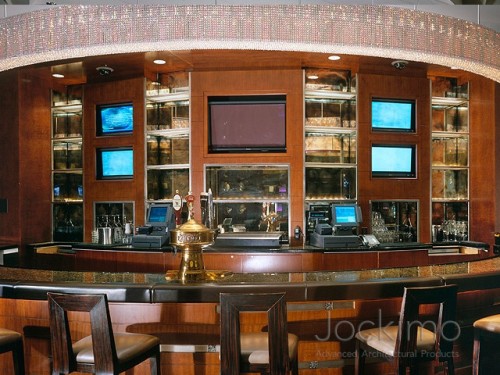 Jockimo provided over 80 Antique Tarnished Mirrors on this redesigned portion of the casino. All glass is 1/4" tempered and was supplied cut to size per our customers request. The mirrors are used in the bar on the Casino High Limits Floor - the mirrors line the back bar shelving.
