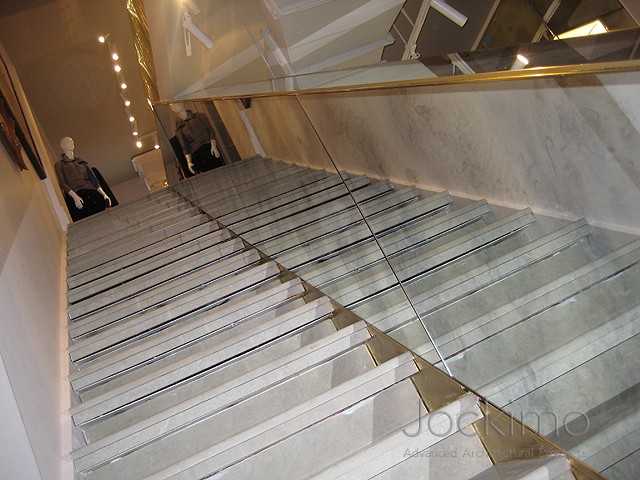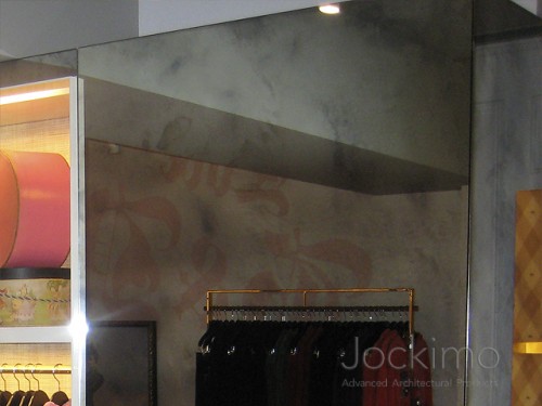 Our 9100 White MirrorUnique™ glass is utilized in this flagship store located in Athens Greece. Our mirrors are installed on the walls throughout the space. The Mirrors were cut to specified sizes and installed applied directly to the walls.
