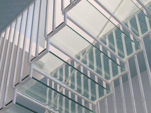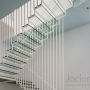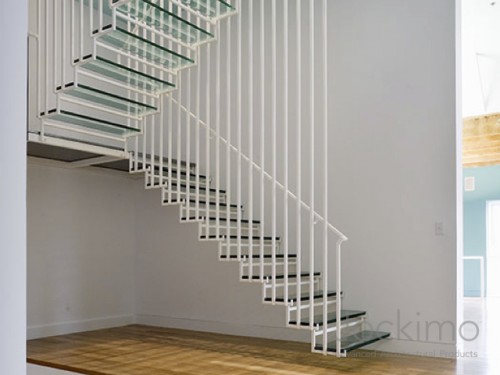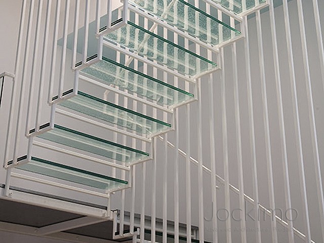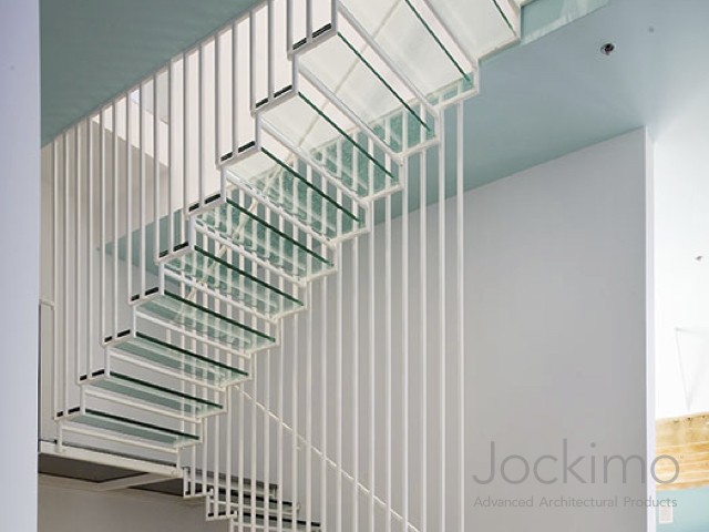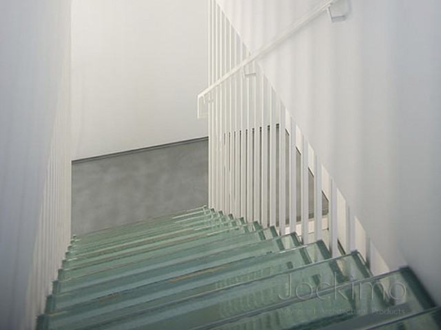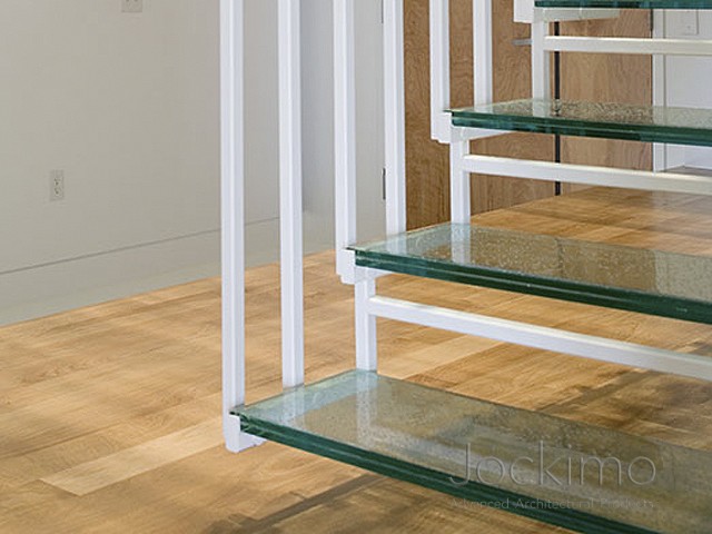 Our Jockimo Crystal Clear™ Glass Flooring is utilized on this residential staircase project in Kansas City, KS. All glass is clear in color (green tint) and is made of 2 panels of 1/2" tempered glass laminated together.