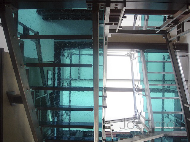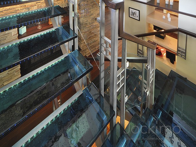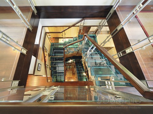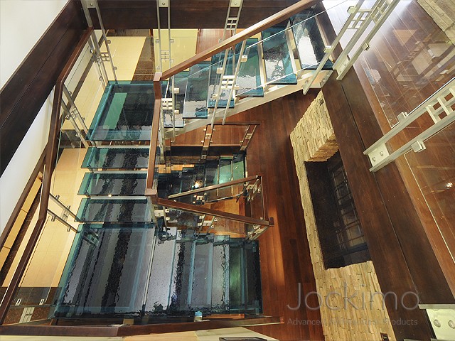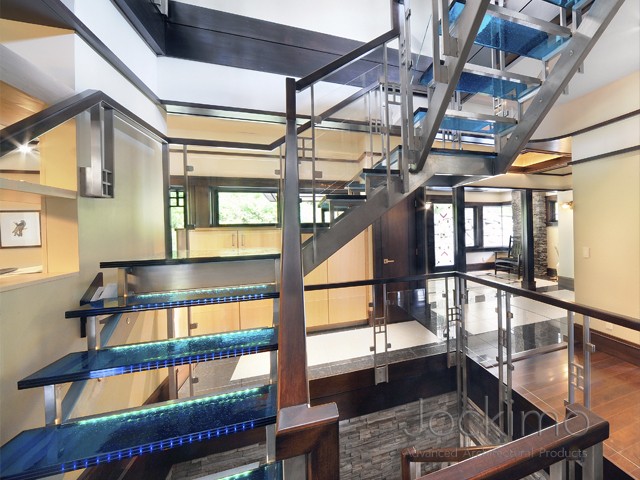 This residential project utilizes our Jockimo Crystal Clear™ glass in Azuria blue color. All edges of the glass treads and landing are monolithically polished to provide the nicest finished edge available. The top surface is our Jockimo GlassGrit™ UL tested & approved anti-slip glass. The glass is fully engineered for safety by Jockimo.