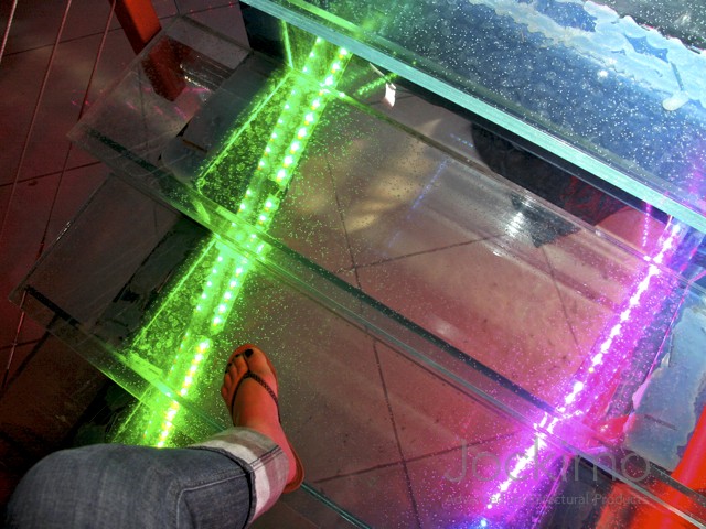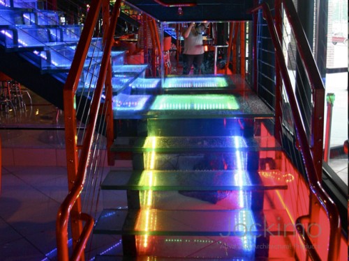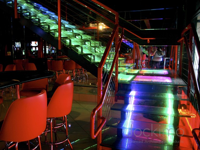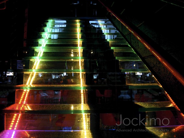 Jockimo’s GlassGrit™ Crystal Clear™ glass flooring is installed in this restaurant/nightclub project in Columbus Ohio. The glass is lit with LED's as you can see in the photos.