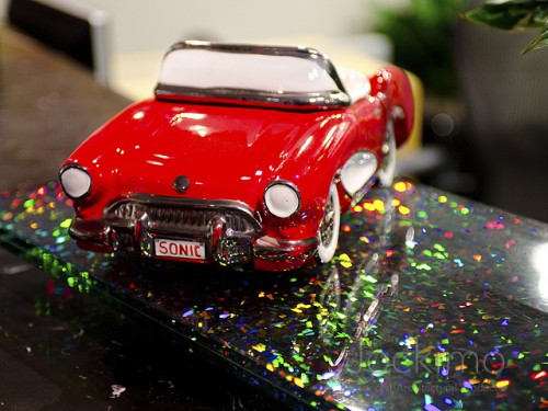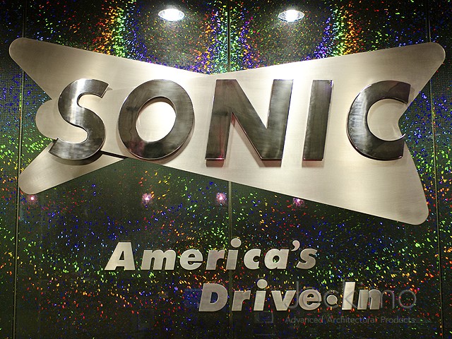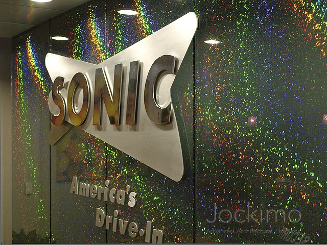 Our Jockimo HologramGlass™ Crystal design glass is utilized behind the reception desk of Sonic's corporate headquarters. The Sonic logo is mounted to our HologramGlass™ using stand offs. Our HologramGlass™ was also used as the transaction counter top at the reception desk.