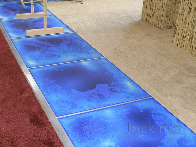 Our Liquid Lava™ panels are utilized on this trade show project. Our interconnecting floor tiles are used as a perimeter of the booth, our table tops are placed throughout the space, and our counter top is back-lit and used as a meeting location in the booth. The Sky Blue/Blue color was used to represent a water theme.